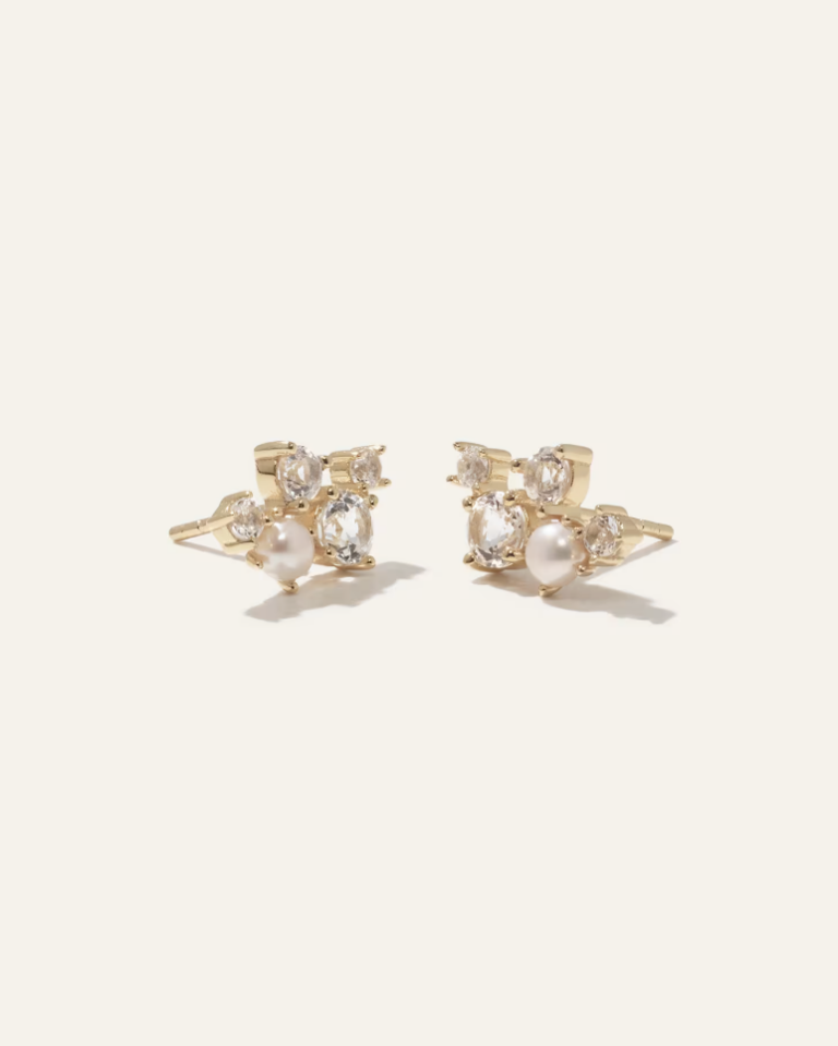These earrings are proof that jewelry doesn’t have to be big or flashy to feel good. They’re simple, lightweight, and just sparkly enough to make you feel like you tried—even on days when you absolutely did not. The climber shape gives a subtle lift along the ear, and the white topaz catches the light without screaming for attention. Set in 18k gold vermeil, they feel elevated but not precious, which matters when you’re living a life that includes school pickup, spilled coffee, and maybe showering… eventually.